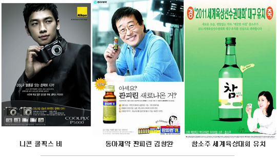 얼마전 TV토크쇼에서 영화배우 차승원이 맥주모델에 관한 옛이야기를 했다. 광고모델이면서 광고주 제품을 음용하지 않아 겪었던 수모에 관련된 이야기다. 평소에도 홍보를 몸으로 보여주지 않아 재계약이 성사되지 않았던 그런 이야기이다. 사실 광고모델과 관련해서는 답을 찾기 매우 힘들다. 다만, 설득커뮤니케이션 과정에서 전문성(expertness), 매력도(attractiveness), 신뢰성(credibility) 등과 같은 에토스(Ethos)가 화자(話者)에게 있어야 한다는 것이다. 적어도 늑대소년이 되지 않으려면 말이다. 동아제약 판피린 광고나 니콘 쿨픽스 광고를 보면서 이들의 매력도는 인정하지만 신뢰성에 의문이 생긴다. 한 사람은 몇 년전 경쟁사의 제품을, 다른 한 사람은 제품은 다르지만 같은 업종에 광고모델로 활동한 바 있다. 물론, 이것을 역으로 이용해 소비자의 “인지부조화”를 극대화한 L텔레콤도 있었지만 왠지 딱 맞아 떨어진다는 느낌은 없다. 반면 참소주는 참 좋은 모델이다. 3월 27일 케냐 뭄바사에서 날아온 2011년 세계육상대회 유치 소식에 대구시민들 참소주 꽤나 마셨을테니까 말이다. 가리키는 손가락이 아니라 달을 보게 해야 좋은 모델이 아닐까 싶다.