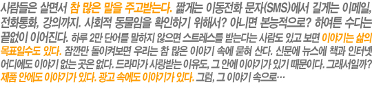 세상 여기저기서 “스토리텔링”이란 말이 많이 사용되고 있다. 신화나 옛날 이야기 처럼 이미 오래 전부터 있었던 것이지만 새롭게 각광받고 있다. 광고라기보다 재미있는 이야기 시간, 이야기 공간으로 제시된 광고에 시선이 모이고 더 많이 읽힌다.“소비자들은 누구나 자기 나름의 세계관을 가지며, 그 세계관은 당신이 상품을 판매하는 데 영향을 미친다. 소비자의 세계관은 당신의 모든 말과 행동을 독자적으로 해석하도록 만든다. 그들의 세계관에 맞추어 스토리의 틀을 짜라. 그러면 당신의 이야기가 그들에게 들리게 될 것이다.” <마케터는 새빨간 거짓말쟁이>에서 마케팅 구루 세스 고딘(Seth Godin)은 이렇게 말하고 있다. 이제, 광고에도 스토리텔링 크리에이티브 시대가 온 것이다.