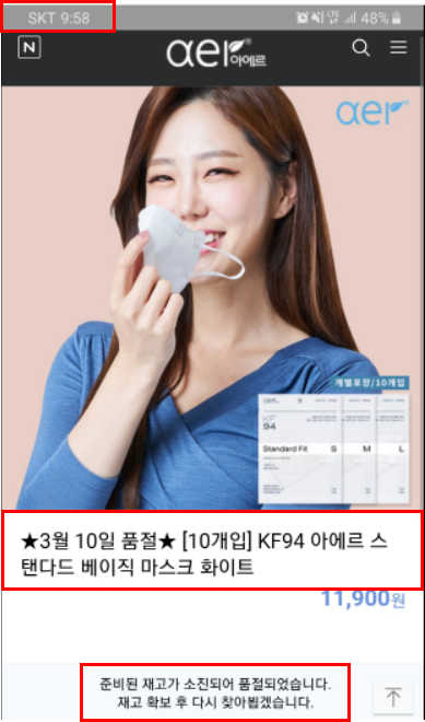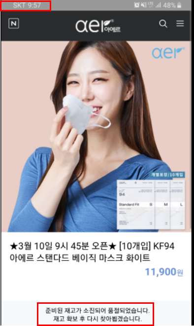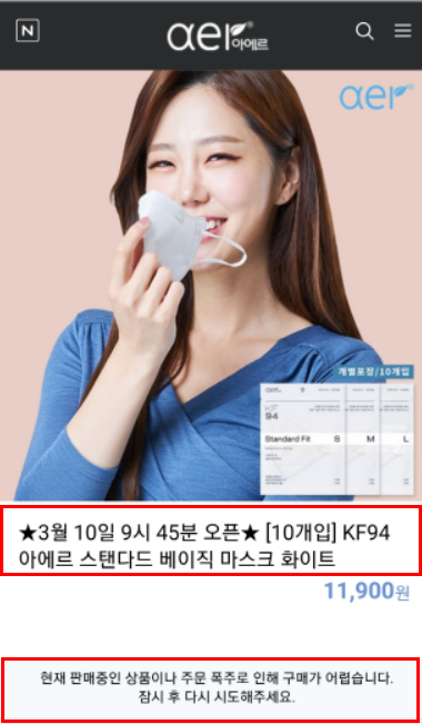 그 중 항상 평일 같은시간대에 판매를 하는 곳 아에르(aer)의 마스크 구매를 시도해 봤습니다
