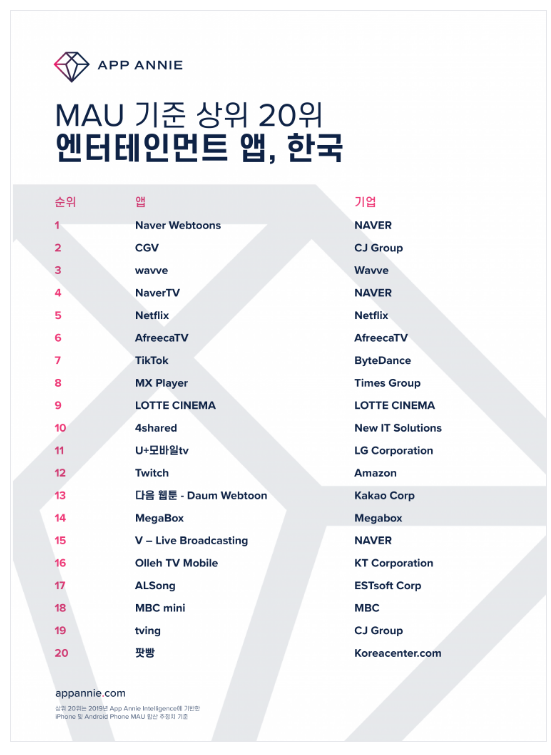 네이버 웹툰(1위), 네이버TV(4위), V-Live(15위)로 네이버가 강세