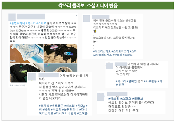 콜라보와 관련하여 사람들이 소셜미디어 공간에서 나눈 이야기들을 직접 살펴보면 방송으로 즐기던 ‘싹쓰리’와 관련된 상품이 재밌기도 하면서, 실제 상품의 품질 역시 높아서 큰 만족감을 보이는 의견이 다수였습니다. 또한 ‘품절’, ‘매진’이라는 표현이 자주 등장하며 싹쓰리와의 콜라보 상품들의 인기를 보여주었습니다.
