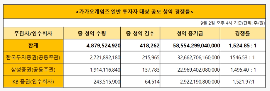 카오게임즈가 2일 공모주 청약을 1524.85 대 1의 경쟁률에 약 58조5542억원의 청약 증거금마무리했다