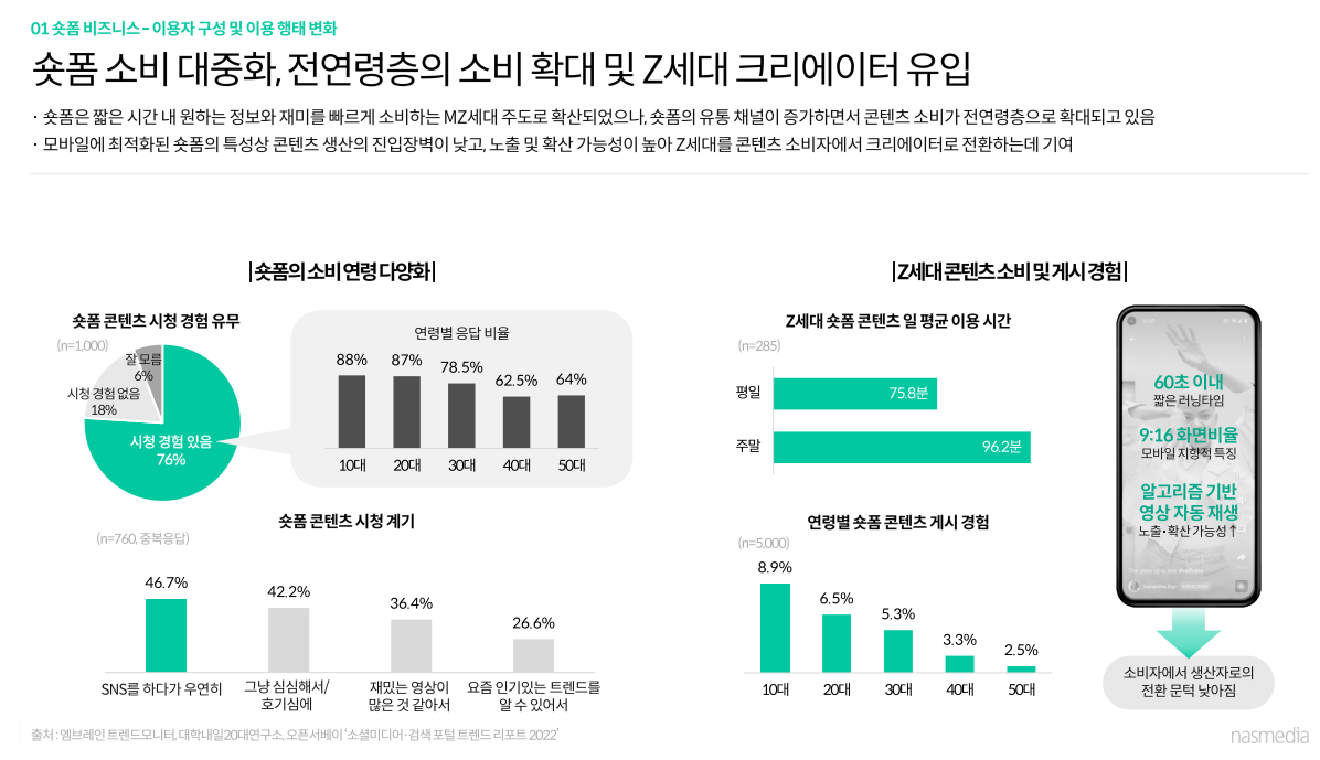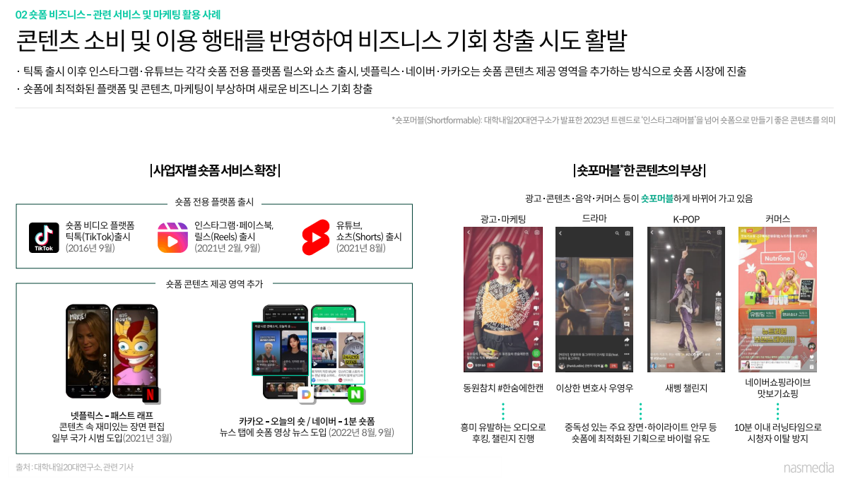 사업자별 숏폼 서비스 확장 / 숏포머블한 콘텐츠 부상