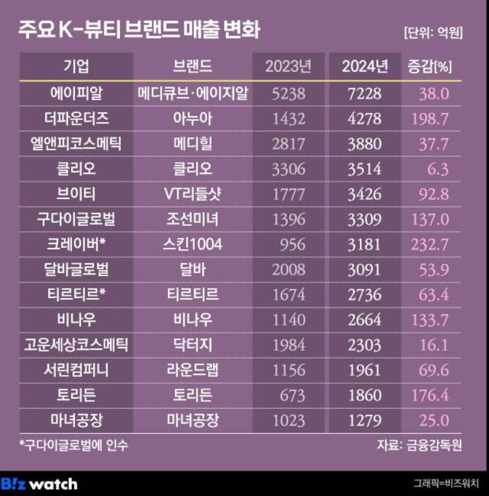 오늘은 금융감독원 자료를 바탕으로 2024년 국내 주요 K-뷰티 브랜드들의 매출 변화를 한눈에 파악할 수 있는 인사이트를 전해드립니다.