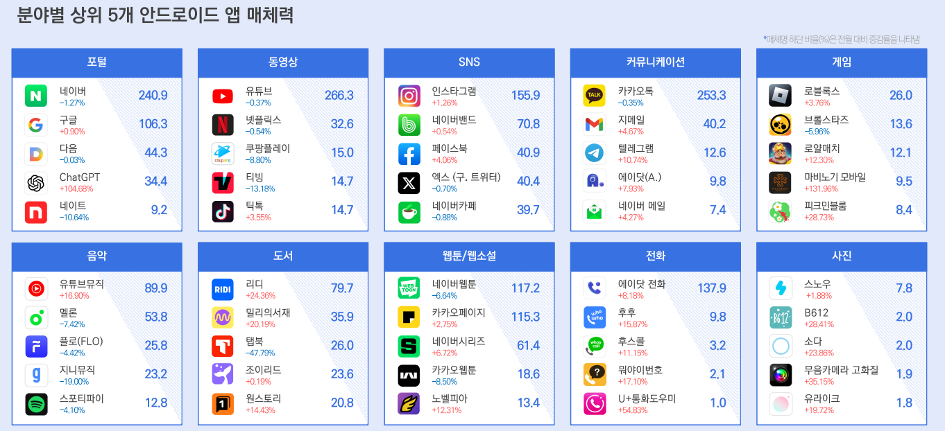 ✅ 음악: 유튜브뮤직, 매체력 16.90% 상승. 그 외 음악 앱 매체력 감소
