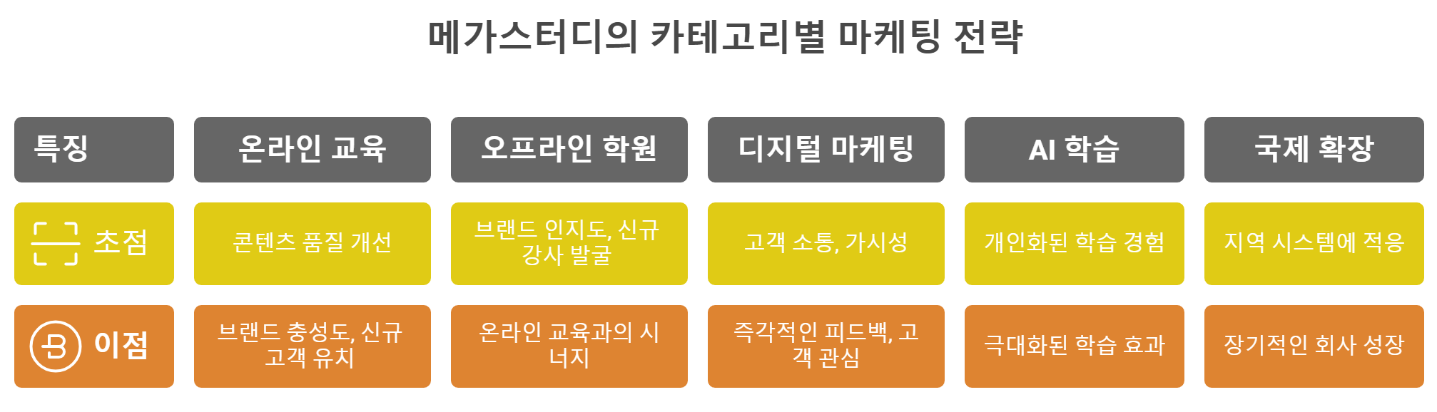 메가스터디의 카테고리별 마케팅 전략 방향성은 다음과 같은 주요 요소로 구성됩니다.